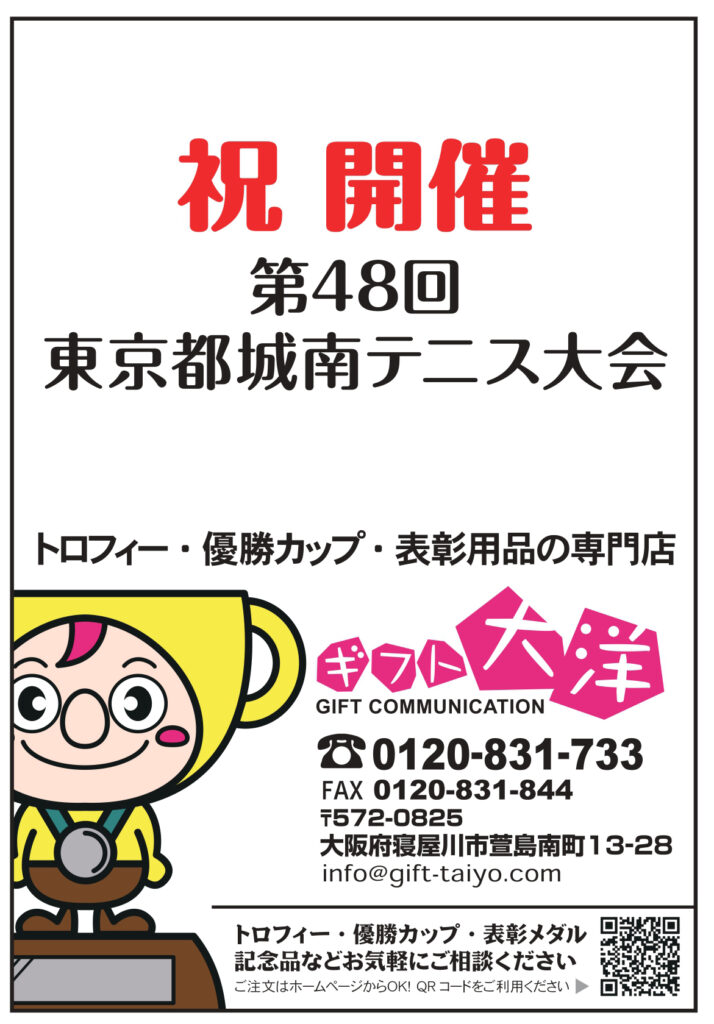 特にご協力をいただきました参加校の顧問の先生方、会場提供をしていただきました狛江高校・駒場高校・京華高校・城東高校の先生方、ご協力をいただきました久保会長を始め大田区テニス連盟の皆様、テニスユナイテッド様、ウッディ-デザイン様、近畿ニッポンツ-リスト株式会社様、東海学園大学様、株式会社ム-ブ様、日本工学院様、伊豆高原ロブィング様、HEAD Japan株式会社様、ギフト大洋様、株式会社コスモエージェンシ-様の協賛企業様にはこの場を借りて感謝申し上げます。